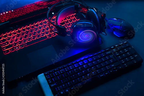 Laptop, computer, keyboard, mouse, headphones accessories for the gamer on the background of the monitor with the game, the workflow - Buy this stock photo and explore similar images at Adobe Stock |